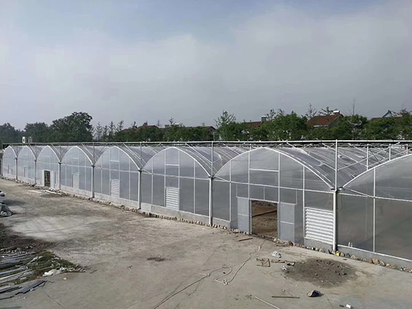 2、簡易連棟大棚:一般跨度在8米,這種大棚顧名思義比較簡單,一般不包括風(fēng)機(jī)、遮陽系統(tǒng)等,簡易聯(lián)棟大棚搭建要比單體薄膜大棚要貴些。